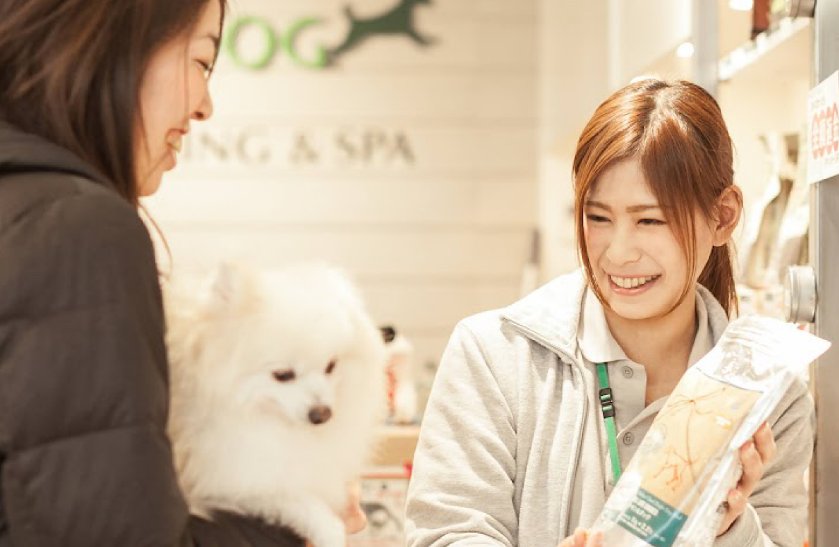 お客様のお買い物対応、グルーミングや病院の受付およびお会計対応